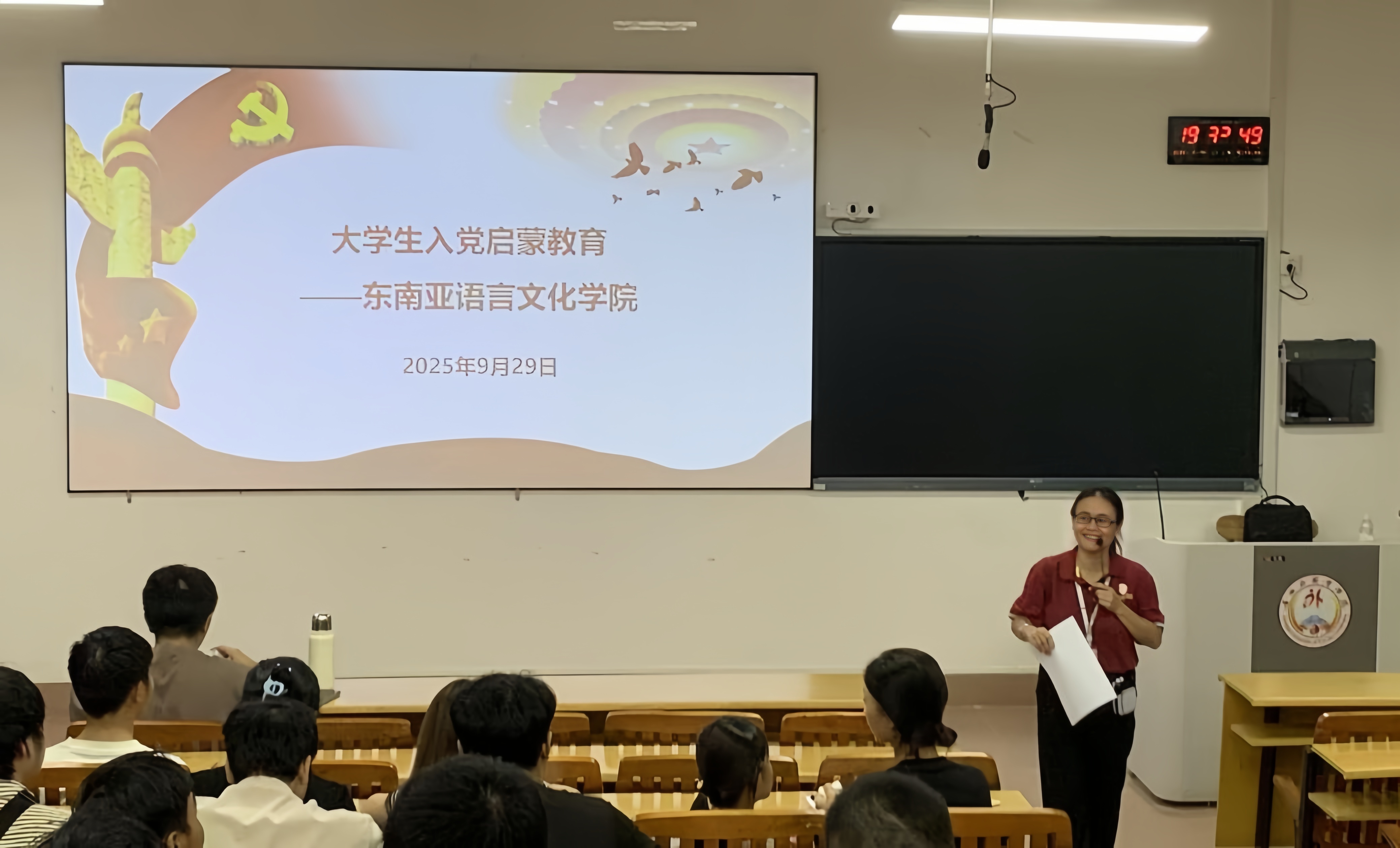 为引导2025级新生了解党的历史、坚定理想信念,近期,东南亚语言文化学院分校区、分批次开展新生入党启蒙教育专题党课。学院党总支书记韦美神、教师党支部书记阮娇龙分别主讲,课程于9月26日、28日、29日,在五合校区 A202教室、空港校区大同楼107教室有序进行,覆盖两校区全体新生。