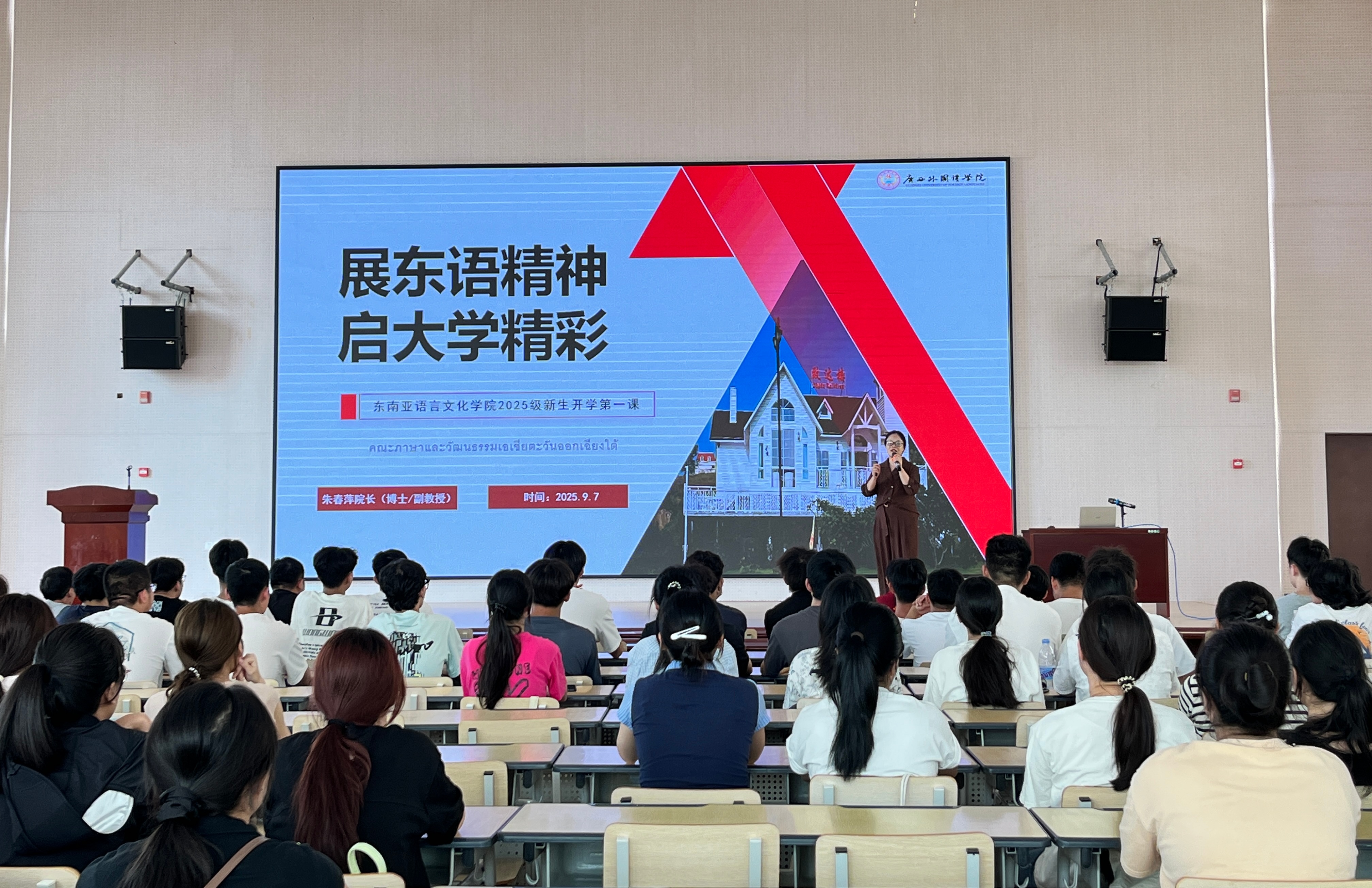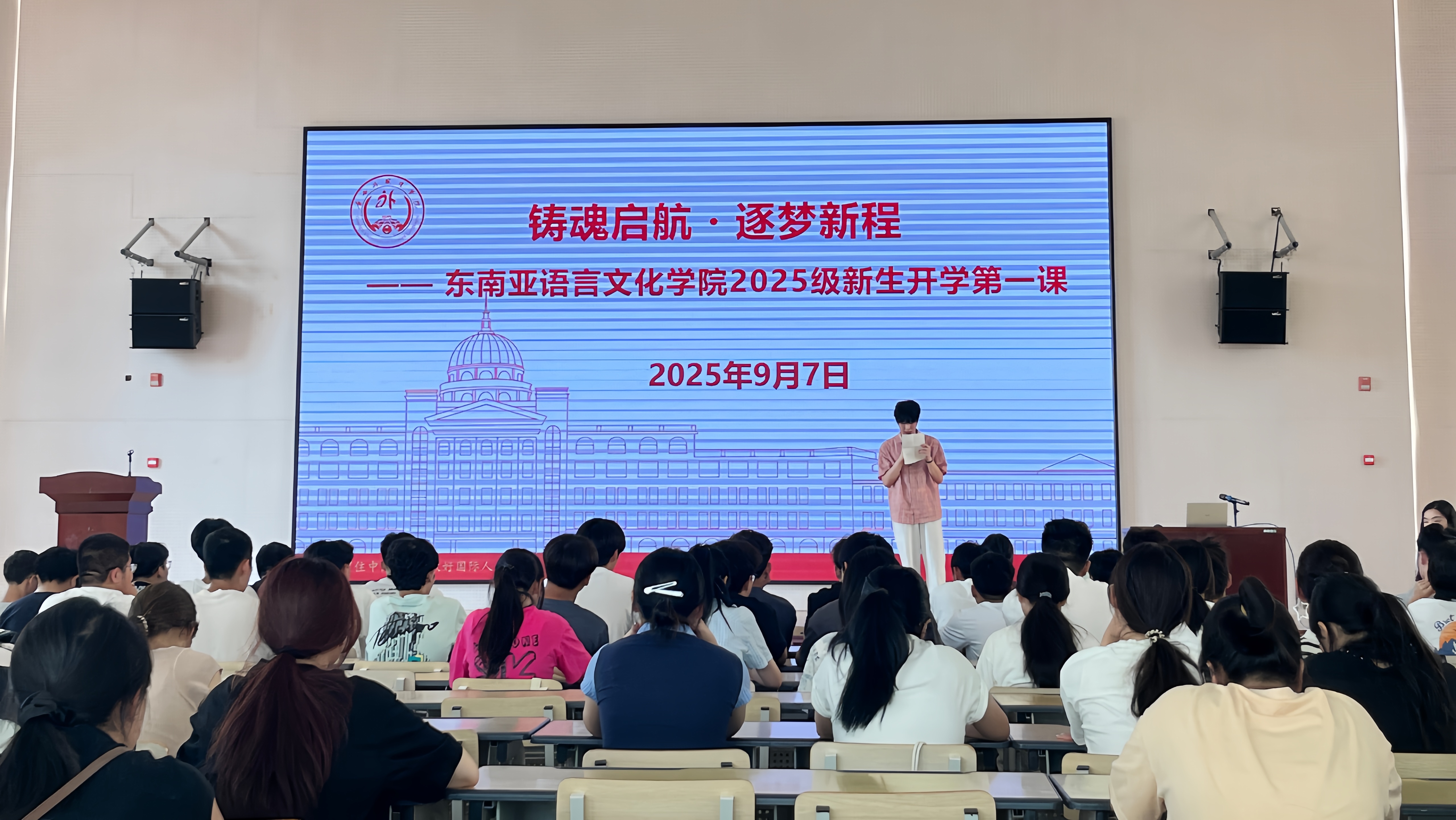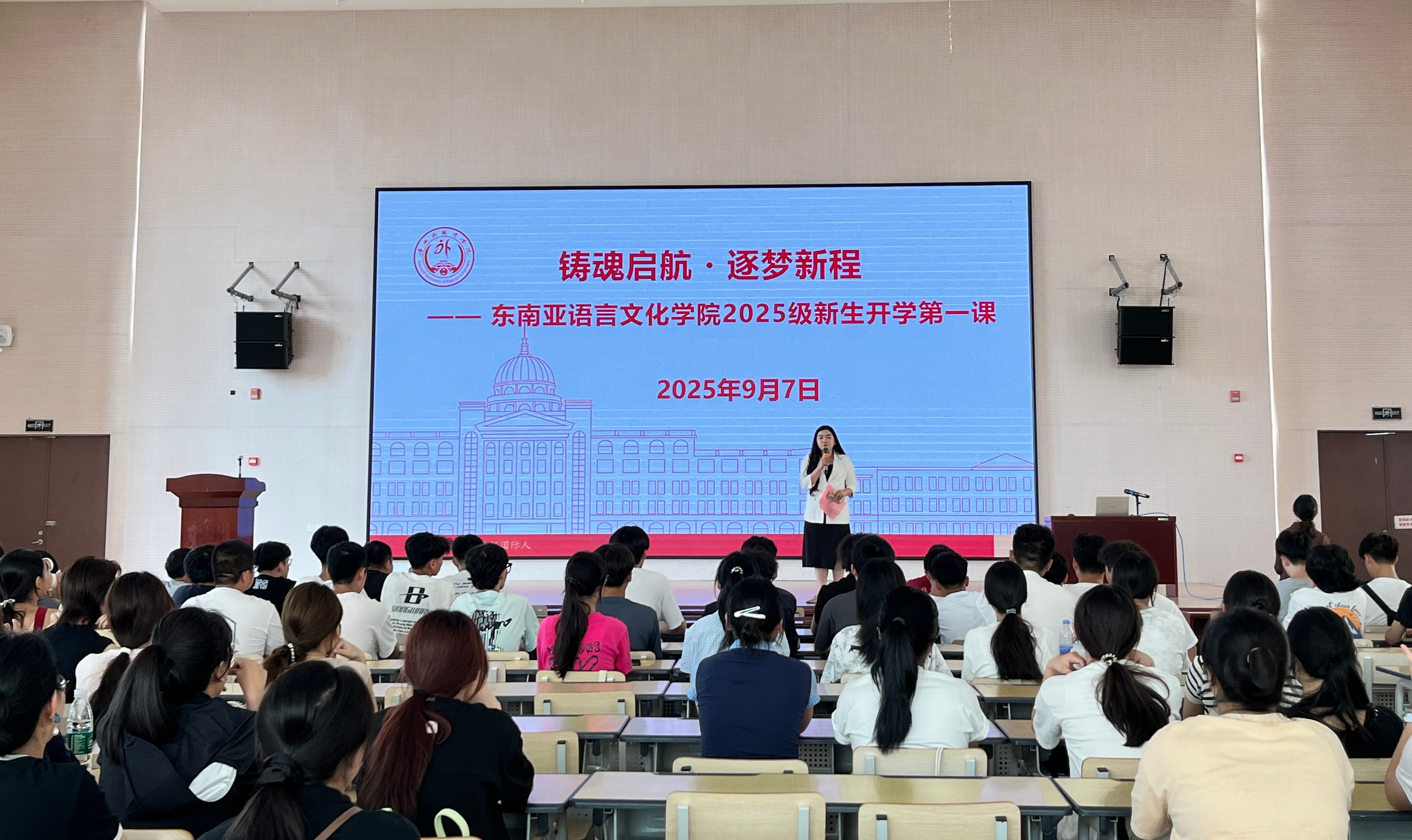 9月7日,东南亚语言文化学院在空港校区博学大讲堂(东)举行“铸魂启航・逐梦新程——东南亚语言文化学院2025级新生开学第一课”活动。学院领导、老师以及全体2025级新生齐聚一堂,共同开启大学新篇章。