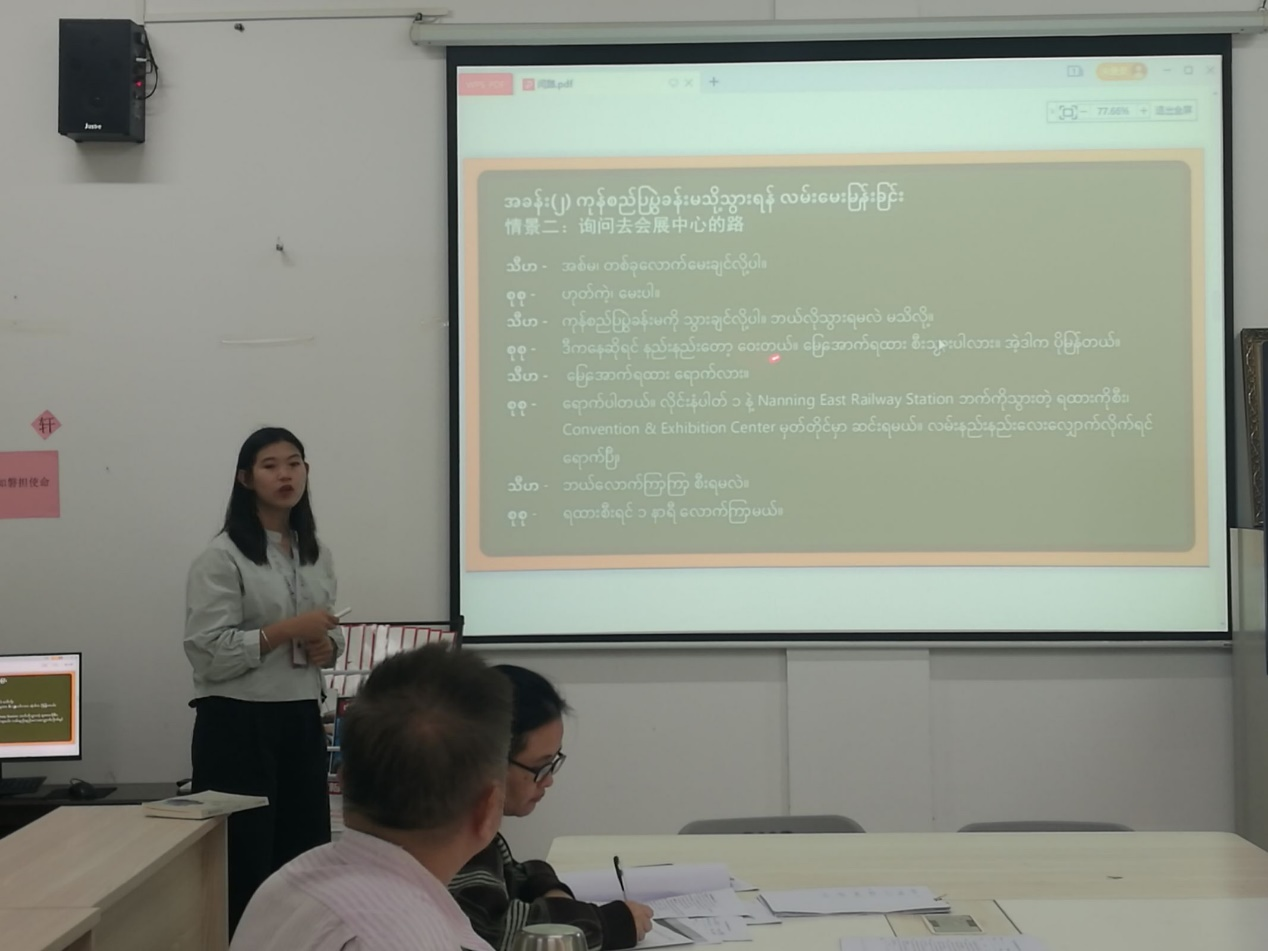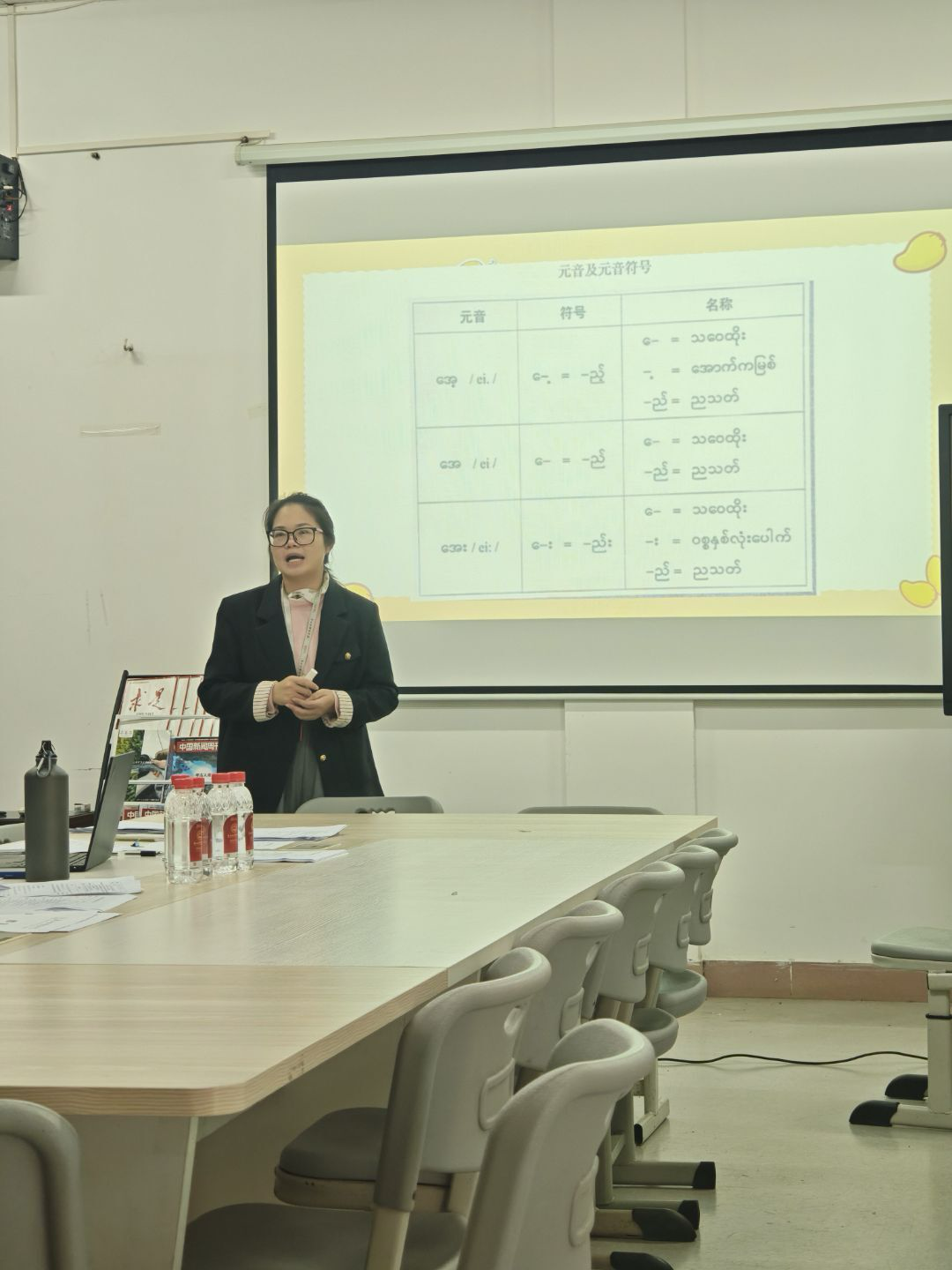评估是契机,建设是核心。在学院的统一领导和周密部署下,缅甸语专业高度重视此次磨课活动,将其视为自我检视、自我提升的关键环节。活动打破了传统的“单兵作战”模式,采用“教师主讲、集体研讨、反复优化”的闭环流程。在本次磨课活动中,黄丹梅老师对《基础缅甸语(一)》课程的语音模块进行了系统梳理与演示,邱嘉媚老师展示了《基础缅甸语(三)》中文化背景与语言运用的融合教学设计,林德伟老师则围绕《缅甸语口语》课程,精心打造了以学生为主体的情景互动教学模式。 三位教师的模拟授课全面涵盖了从基础理论到高级应用、从知识讲授到能力培养的多个维度,充分展示了本专业课程体系的层次性与教学方法的多样性。