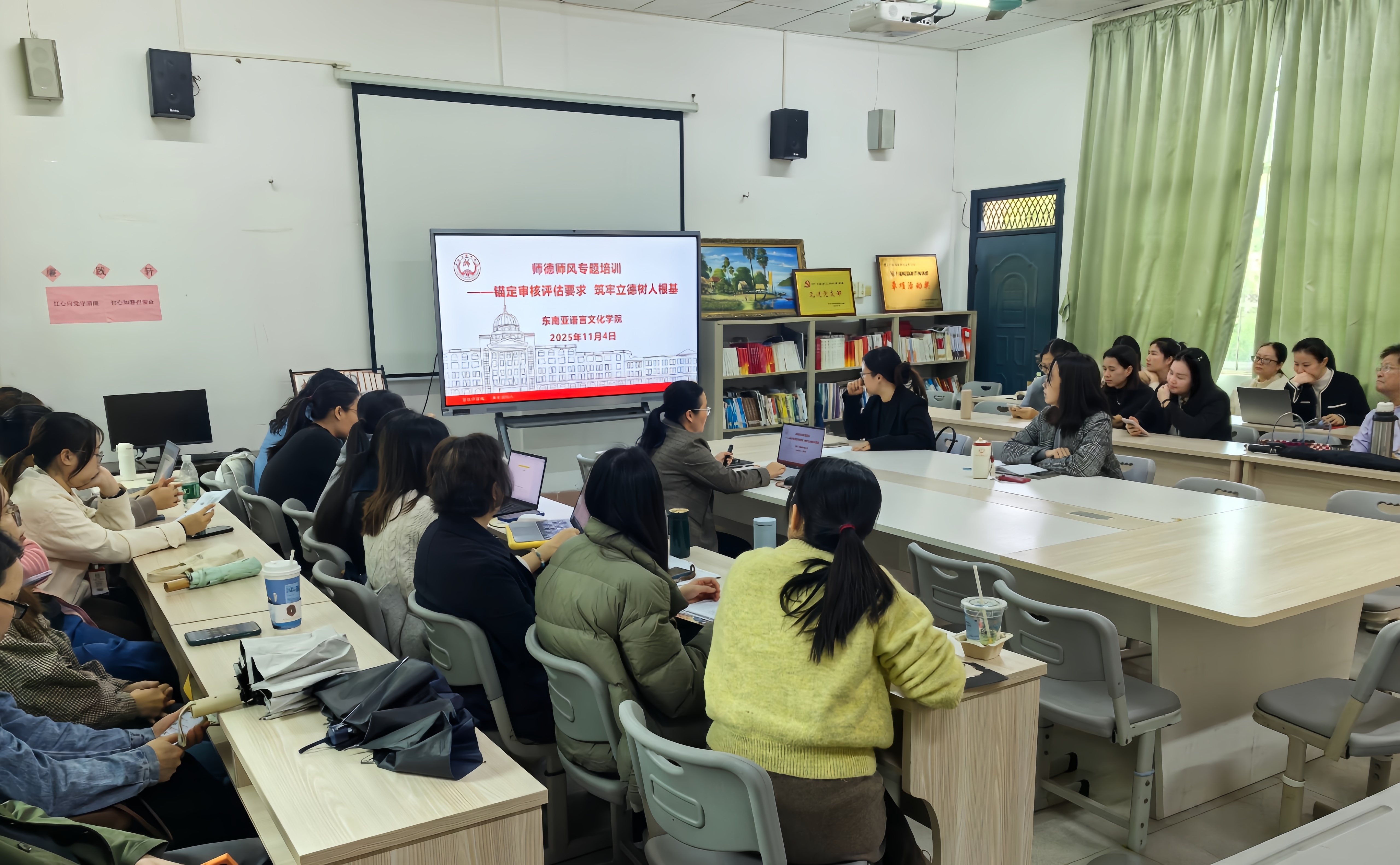 为锚定本科教育教学审核评估要求,筑牢立德树人根基,11月4日,东南亚语言文化学院在文化园114会议室举办师德师风专题培训,全体教职工参会,凝聚以高尚师德助力评估工作的共识。
