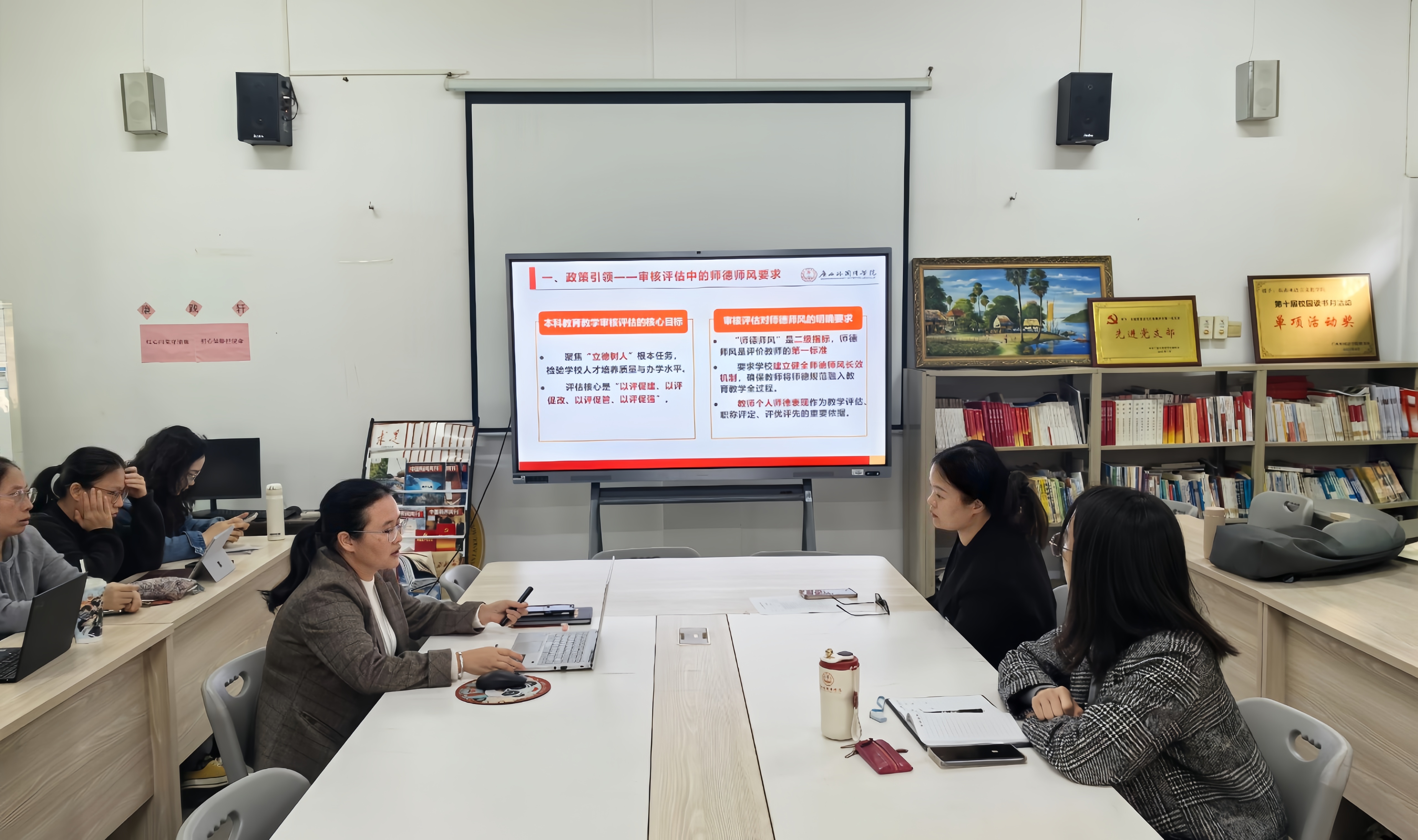 在核心内涵解读环节,培训围绕爱国守法、爱岗敬业、关爱学生等新时代教师职业行为准则,明确了教学、育人、团队协作等与审核评估适配的师德重点。实践路径部分,从课堂教学、科研学术、学生管理服务三个维度,给出了“思政元素与专业知识融合”“恪守学术诚信”“公平对待每一位学生” 等具体践行方向。