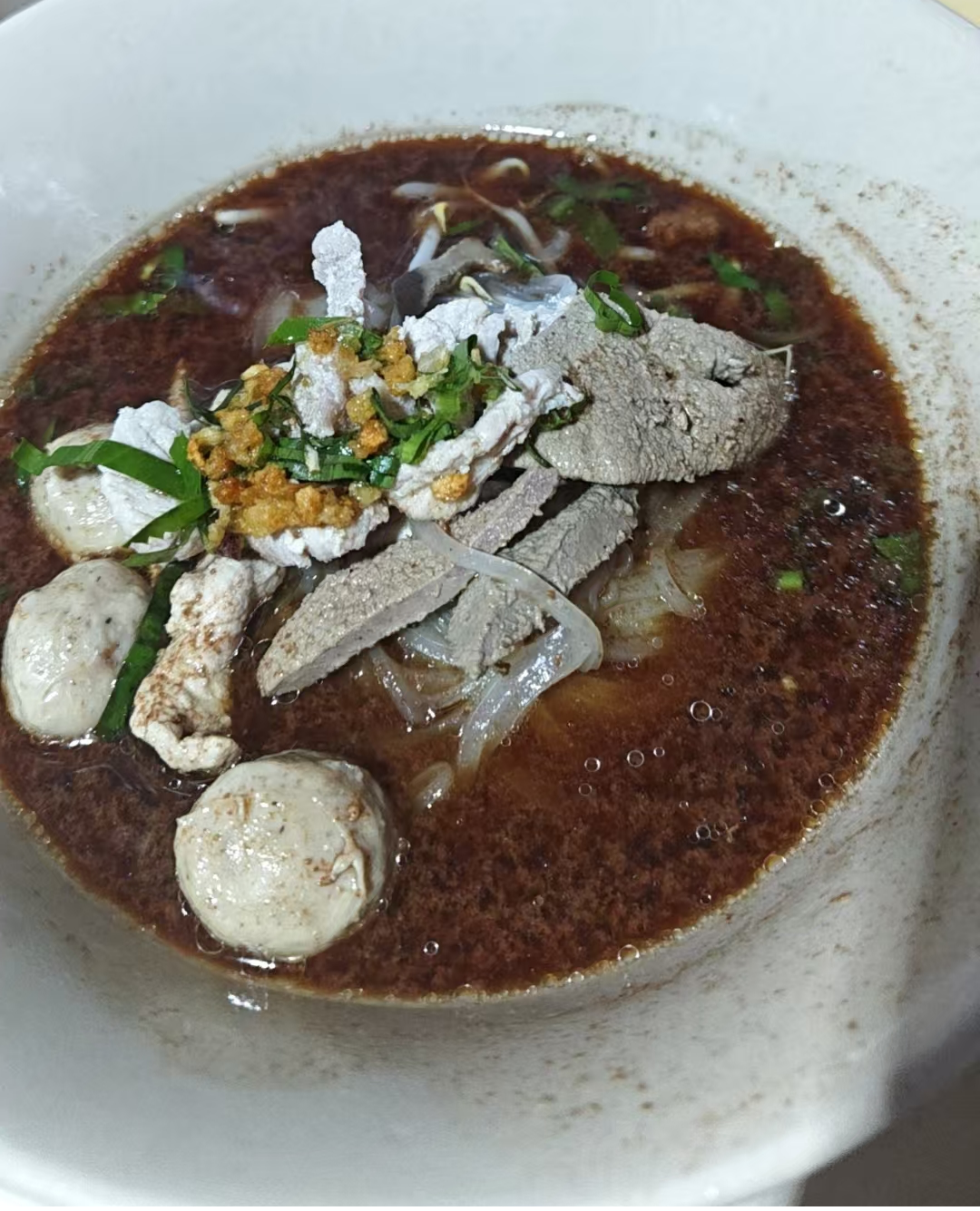 最让人难忘的,还是老师带我们探访曼谷近郊的邦南彭浮动市场(Bang Nam Pheung Floating Market)。不同于游客扎堆的乍都乍周末市场,这里更多是本地人周末放松的地方。河道两旁绿树成荫,我们一边吃着刚出锅的船面(如图4所示),一边和摊主用泰语聊天,真正感受到泰国社区生活的烟火气。