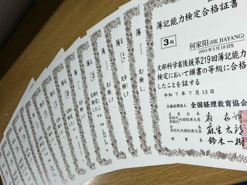 第219回全经簿记考试于2025年7月13日顺利举行,广西外国语学院日语系2022级商务方向模块课的日式薄记班共17名同学报名参加商业簿记3级考试,其中15名同学顺利通过考试,合格率为88.2%,高于日本同期56.48%的平均合格率。其中100分2名,90分以上2名,80分以上5名。